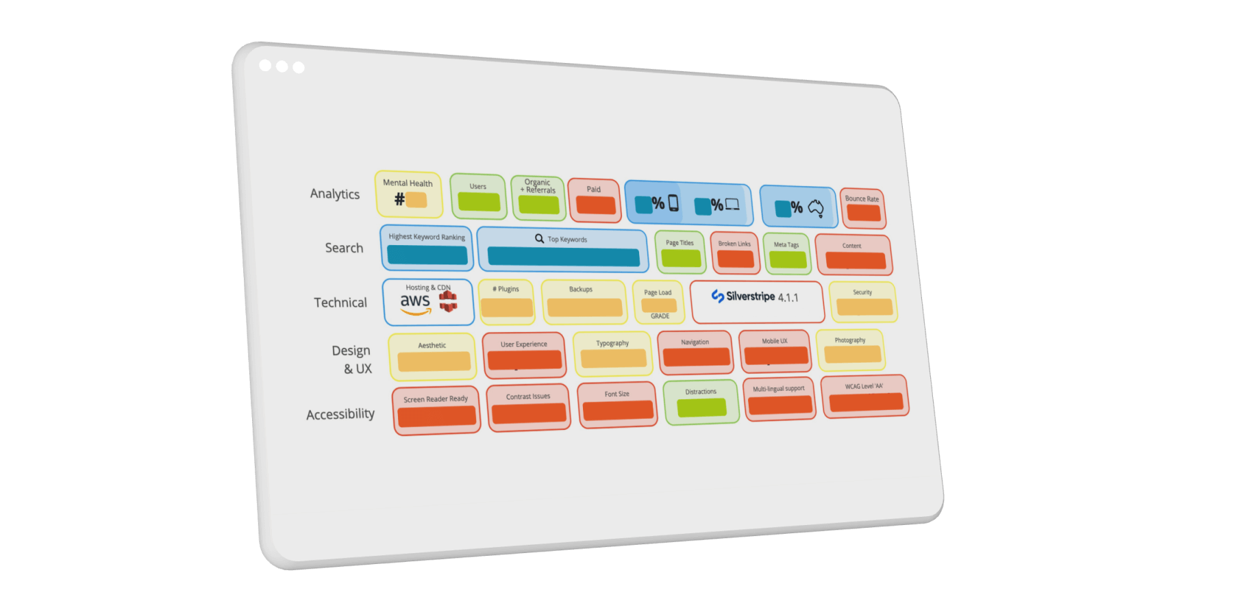 A multifaceted audit of all Neami web assets was conducted, covering website health metrics for analytics, search, technical, design/UX, and accessibility. The workload for auditing the 9 websites was shared across our team so that our specialists could audit each stream accordingly.